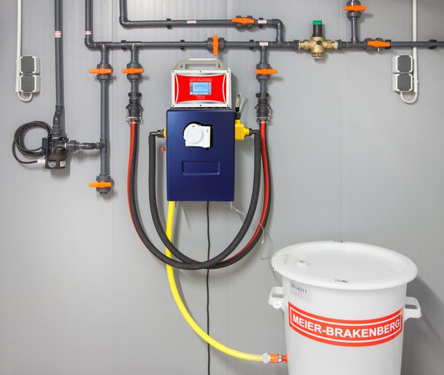 Wasserverteilung im Schweinestall mit fest integriertem, elektrischem Medikamentendosierer MB Dos Touch und Anmischbehälter für Medikamente.